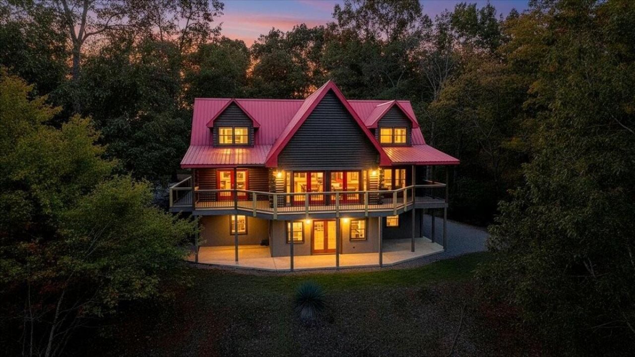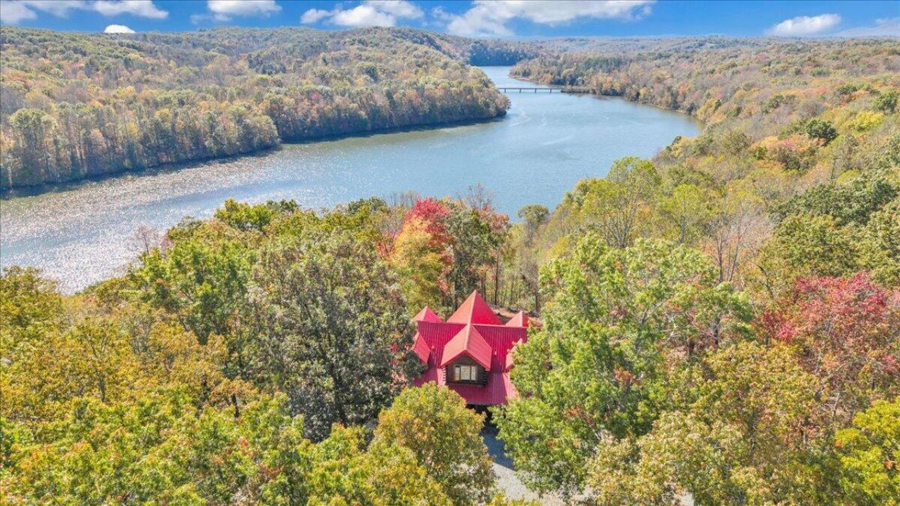 WATERFRONT LOG HOME ON LEESVILLE LAKE. Enjoy the natural surroundings of this beautiful 4,166sf solid wood waterfront log home with 3 levels on Leesville Lake. 431ft of waterfrontage on 9.12 acres. The classic dark finished log exterior and vibrant red metal roof provide an inviting timeless design. There are pine floors throughout the main and upper levels. A mix of covered porches and decks at just under 1,000sf surround 3 sides of the home. MAIN LEVEL: 1,515sf features an open floor plan, generously sized great room with vaulted ceiling, and 2 sets of French doors that lead out to the waterside deck that spans the entire back of the home. The large kitchen with cooking island is adjacent to the dining area with French doors that open to a covered portion of the deck. Main level primary